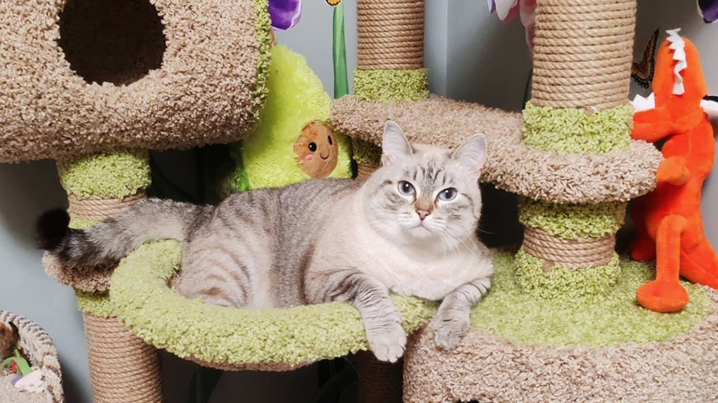 Номер "Комфорт" (140 Х 80 Х 110 см) оснащен двумя уровнями с домиком, миской, лотком с тофу, лежанкой и когтеточкой. Также котику включают расслабляющие теле-программы. Стоимость - 600 рублей за сутки.